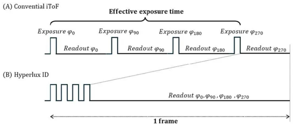 常规 iToF 传感器在每次相位曝光后,都会将数据读出到外部处理器。从第一次 φ0 曝光到 φ270 曝光完成,需要一定的时间。如果目标物体在此期间移动,则感知结果中会出现运动伪影。Hyperlux ID 内置存储器,可以保留必要的相位数据。这里的技术突破在于,所有四相信息都直接存储在像素中。曝光结果原封不动地存储在像素存储器内。因此,下一相位曝光可以在很短的时间内开始,从而减少了四个相位的总曝光时间,运动伪影得以大幅减少。