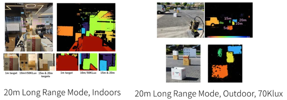 此外,这些产品还支持像素合并。如果 VGA 分辨率足够,那么将 120 万像素进行像素合并,可以提高 VGA 传感器的灵敏度。距离分辨率取决于调制频率。与市面上的常规方案相比,我们的产品可以使用相对较高的 200MHz 调制频率。因此,我们的产品性能可扩展,既支持短距离、高精度感知,也支持长距离、高分辨率感知。