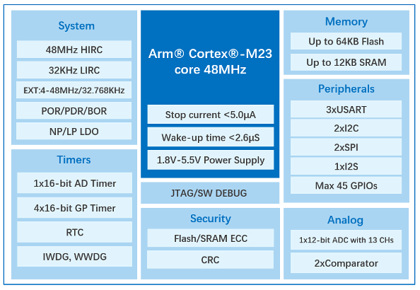存储配置方面,搭载32KB~64KB高可靠嵌入式Flash和12KB低功耗SRAM,全存储区域均配备ECC纠错功能。为满足不同应用场景需求,提供TSSOP20/LGA20,QFN28,LQFP32/QFN32以及LQFP48/QFN48等多种封装选择。通过高度集成化的芯片设计,有效减少外部元器件数量,为用户提供物料清单(BOM)成本更优的解决方案。