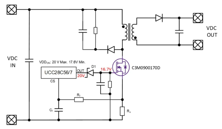 碳化硅 MOSFET 非常适合此类电压等级,并可轻松实现适用于辅助电源应用的低 RDS(ON) 和低开关损耗。设计人员能够利用单开关反激式拓扑,这可以消除了双开关设计所需的额外电路和设计复杂性。