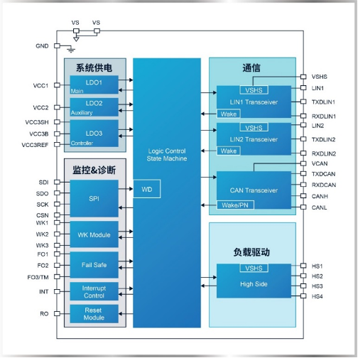 - LIN收发器:支持LIN2.2协议,兼容ISO 17987-4与SAEJ2602标准。