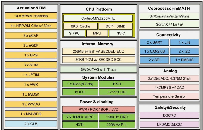 (3)外设:高端产品支持EtherCAT、CAN-FD等工业总线及更多ADC/PWM通道;中端产品支持CAN-FD,精简工业总线;高性价比产品仅保留SPI、UART等基础接口,满足中小功率场景需求。