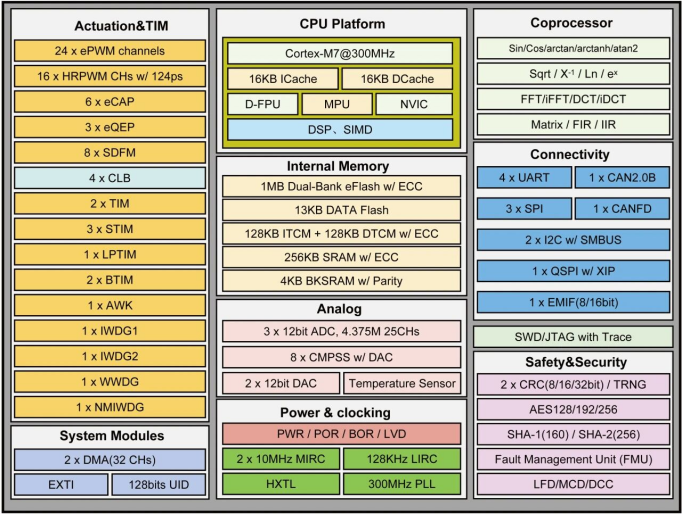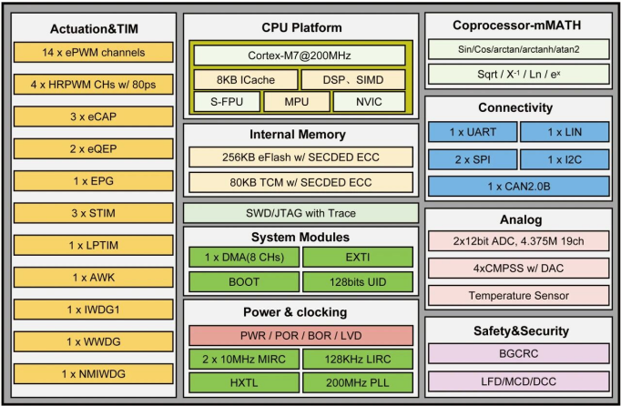 (2)存储:高端产品搭配256K TCM + 1MB eFlash,中端产品128K TCM + 512KB eFlash,高性价比产品80K TCM + 256KB eFlash;